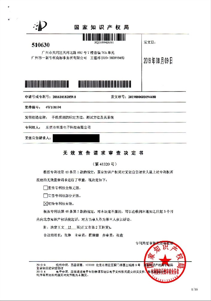 今年,国内某公司针对华盾电子多项发明专利,向国家知识产权局请求宣告无效。据了解,其中手机探测的标定方法、测试方法及其系统(专利号:201610182859.8),一种金属分类的图像显示方法及装置(专利号:201610291906.2),经国家知识产权局“无效宣告请求审查决定书(第41320号)、(第41974号)”决定,维持专利权有效。